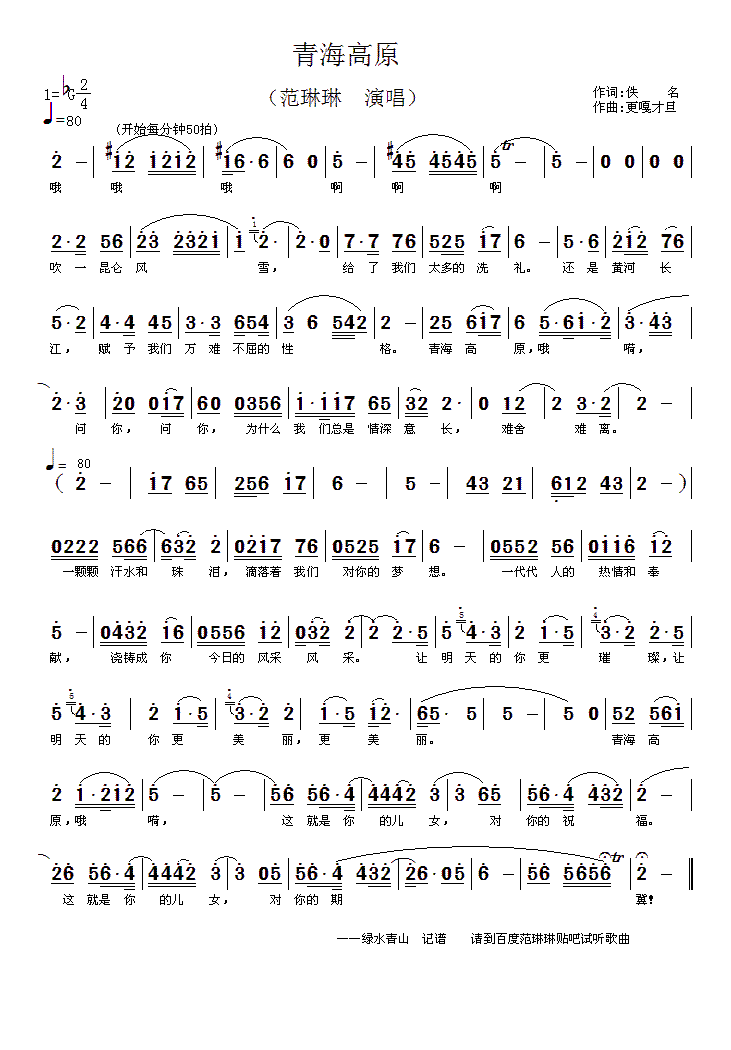 演唱: 范琳琳 词曲: 佚名 记谱/传谱: 绿水青山