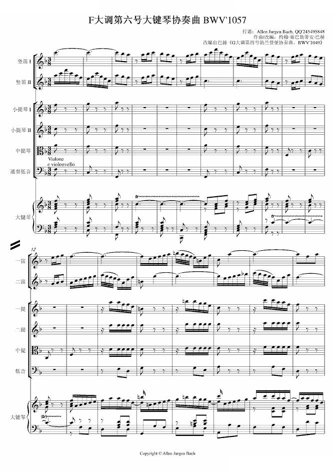 - [钢琴谱] 巴赫第一键盘 钢琴 乐协奏曲 第一乐章