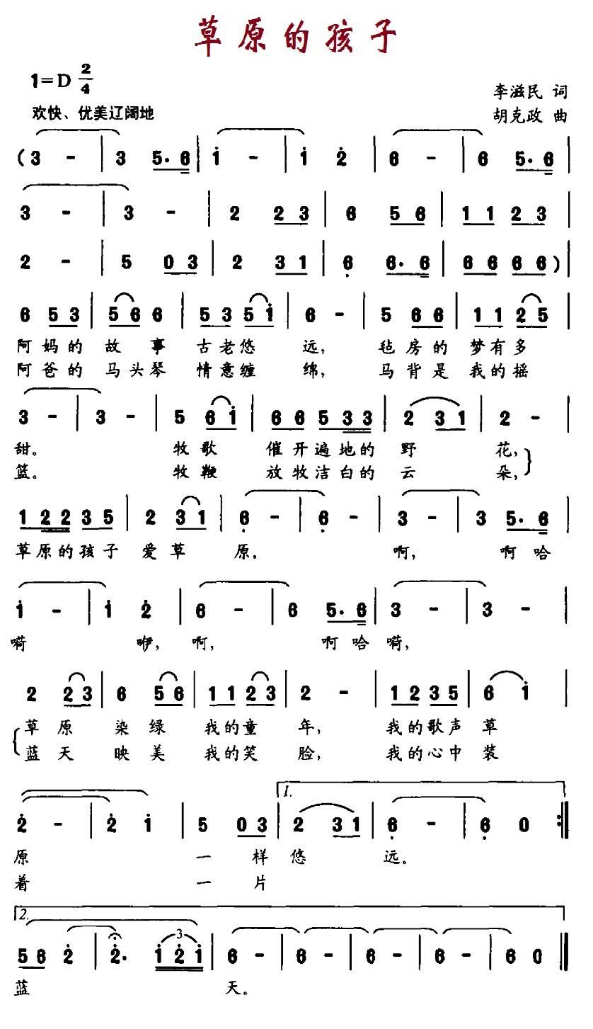- [歌谱] 草原的孩子 何乌兰版
