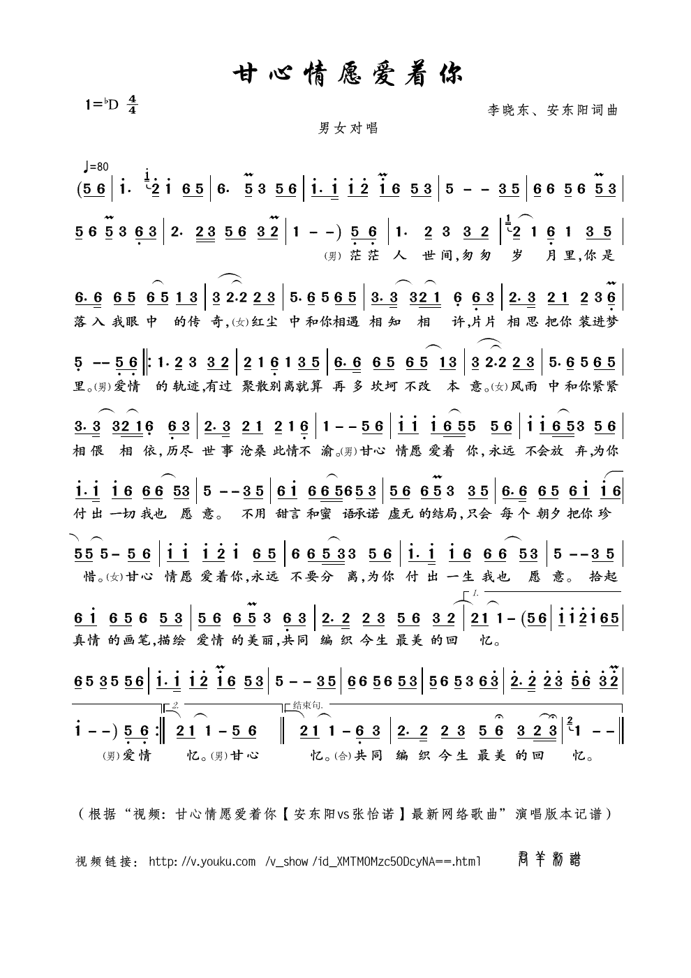 - [歌谱] 甘心情愿爱着你 张怡诺