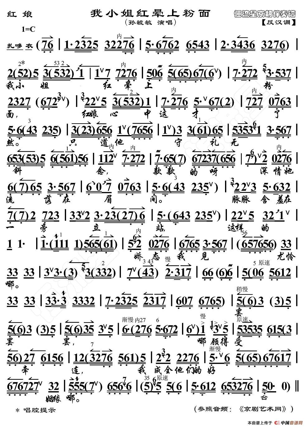 我小姐红晕上粉面 红娘 唱段 京胡伴奏谱