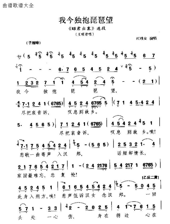 - [琵琶谱,粤剧谱] 粤剧 我今独抱琵琶望 昭君出塞 王昭君唱段