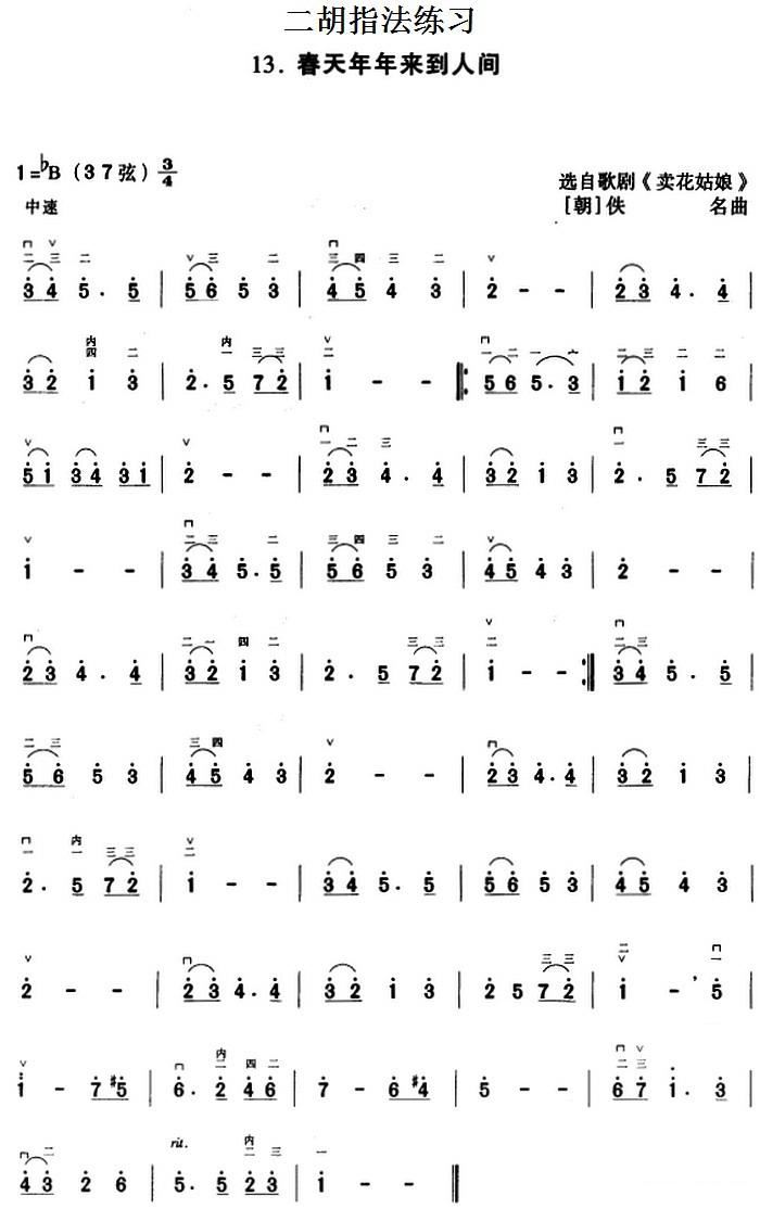 > 二胡指法练习 春天年年来到人间 选自歌剧 卖花姑娘