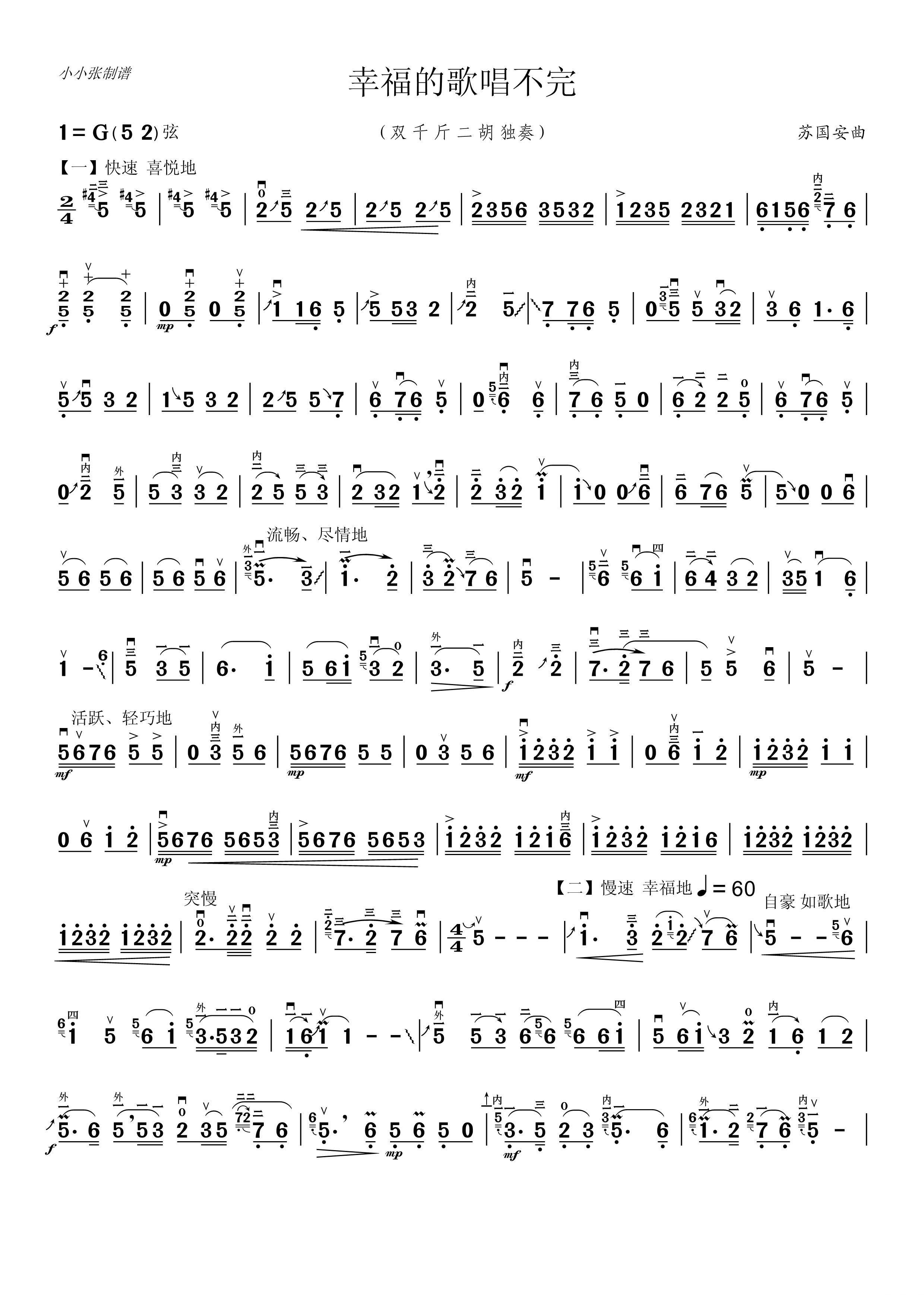 > 幸福的歌儿唱不完二胡独奏 小小张制谱