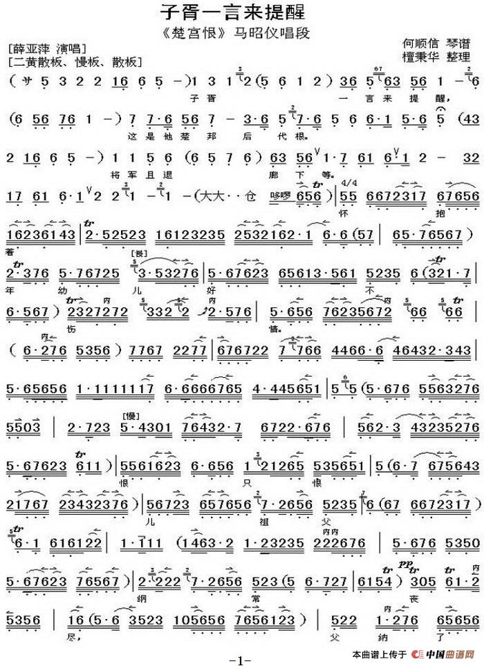 子胥一芽来提醒 楚宫恨 马昭仪唱段 琴谱