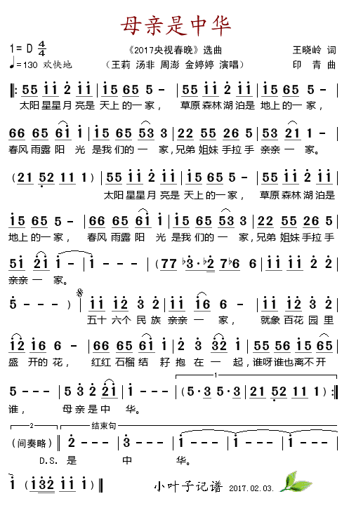 > 母亲是中华 2017央视春晚选曲