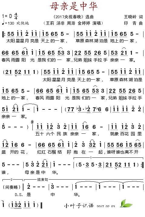 > 母亲是中华 2017央视春晚 选曲