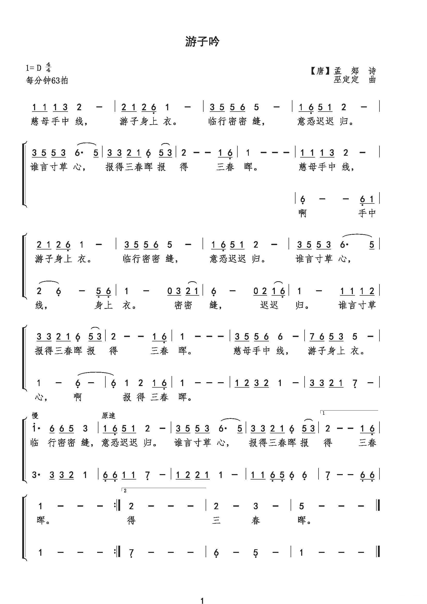 - [歌谱] 游子吟 唐 孟郊