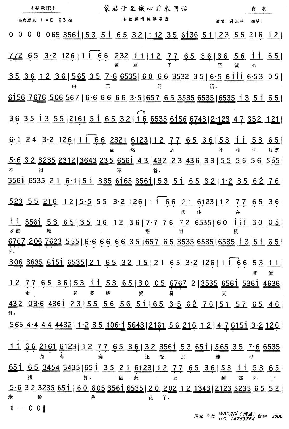 蒙君子至诚心前来问话 春秋配 姜秋莲唱段 伴奏谱