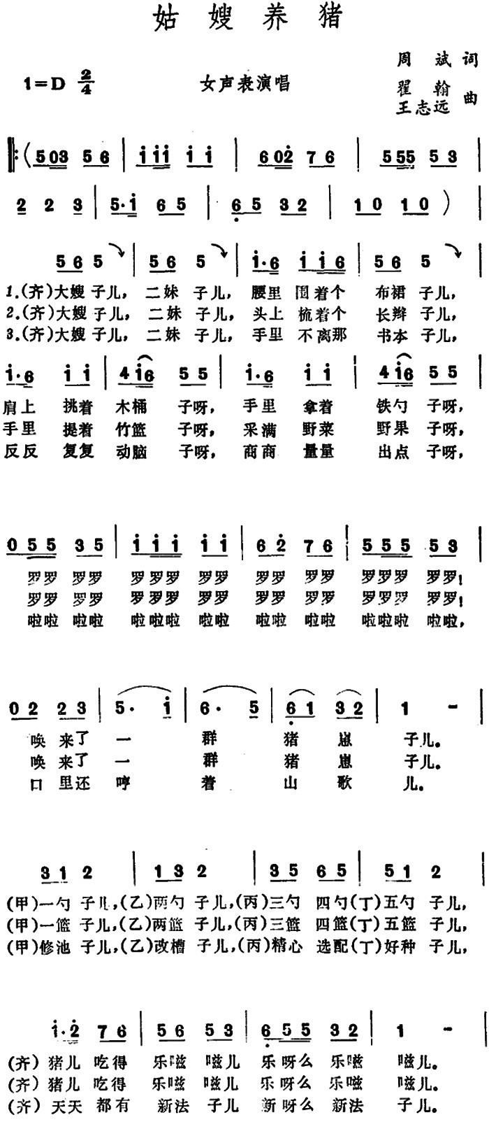 - [歌谱] 养猪歌