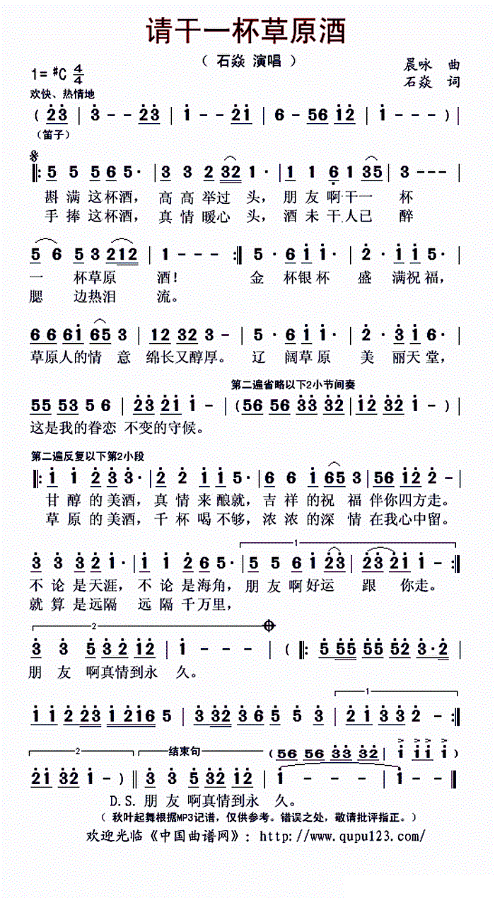 - [歌谱] 请喝一杯下马酒