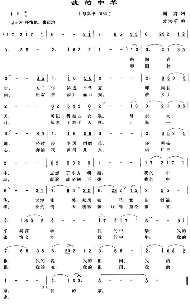 - [歌谱,京剧谱,评剧谱,越剧谱] 我的中华 京歌