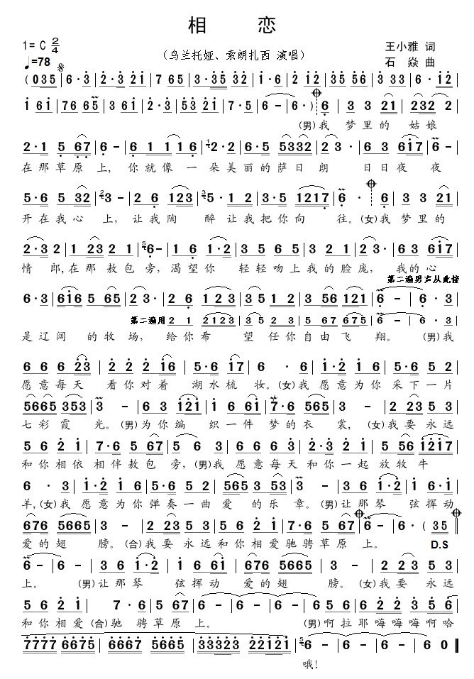- [歌谱] 相恋 乌兰托娅 索朗扎西