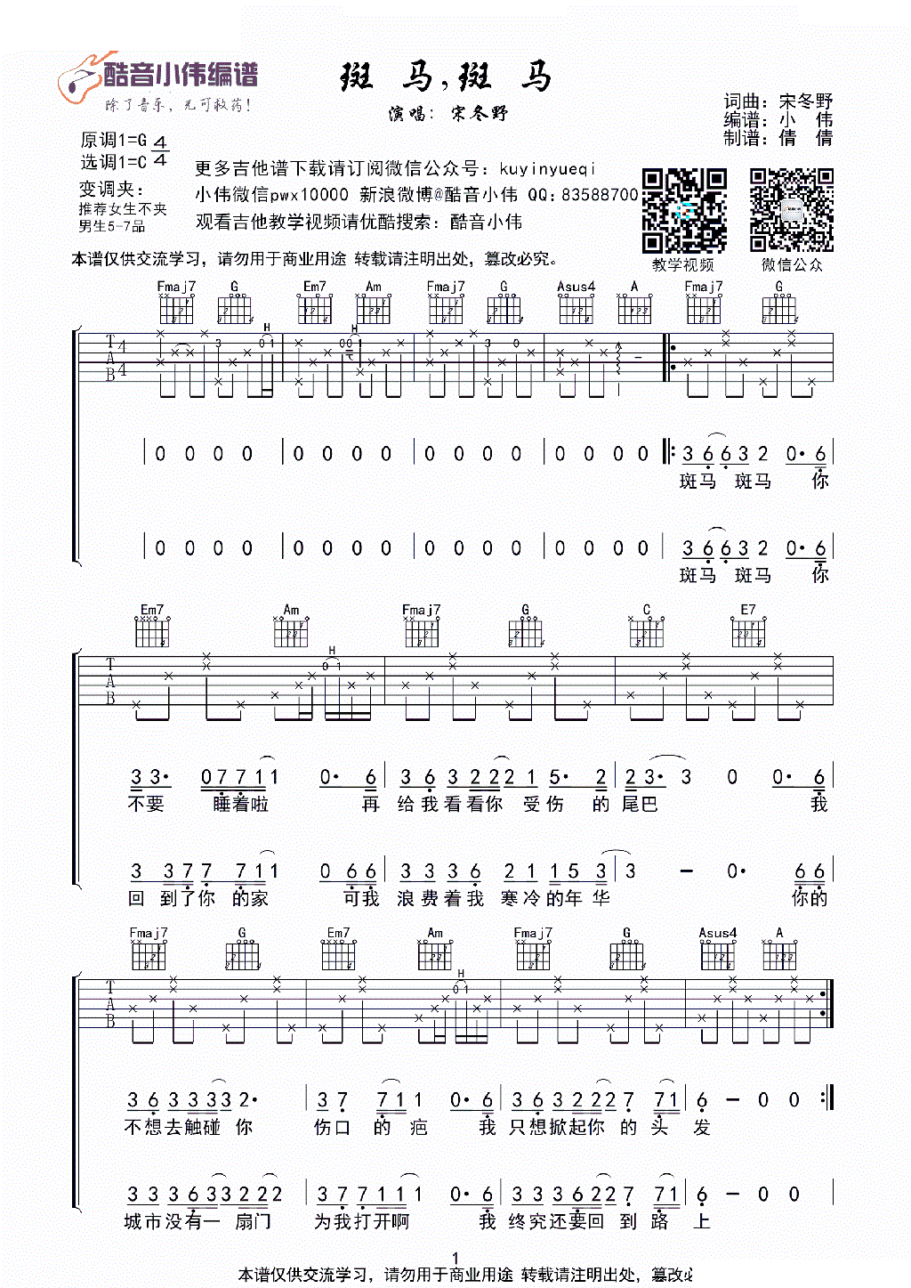 > 斑马斑马 C调带前奏间奏 酷音小伟编谱
