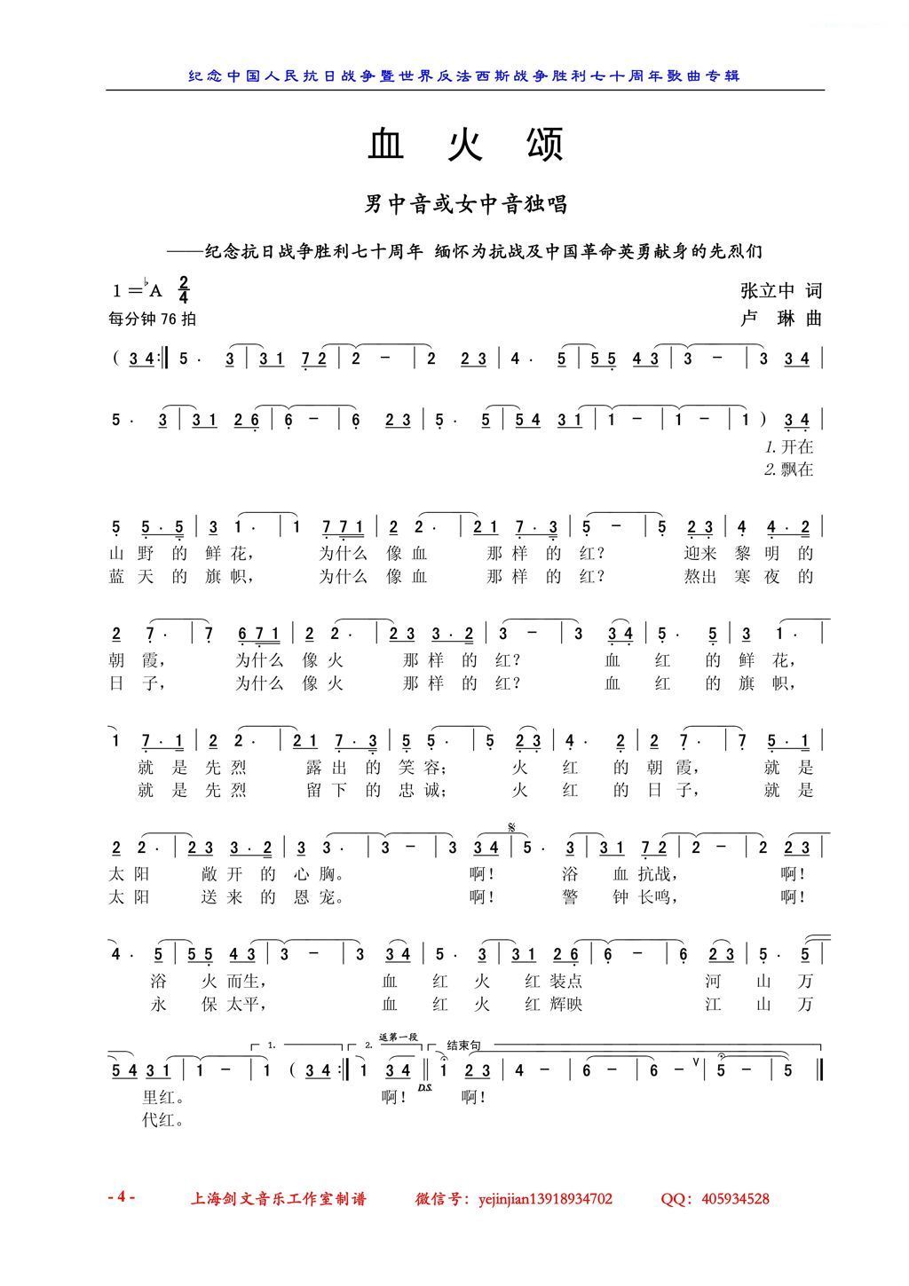 血 火 颂 纪念抗日战争胜利七十周年 缅怀为抗战及中国革命英勇献身的先烈们 男中音或女中音独唱