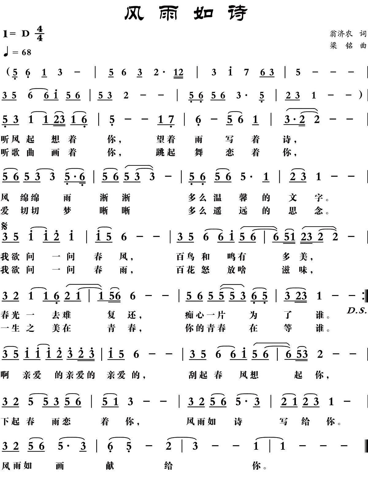 - [歌谱] 读你如诗