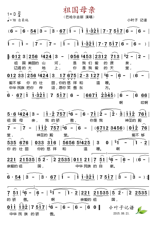 - [歌谱] 啊 祖国母亲