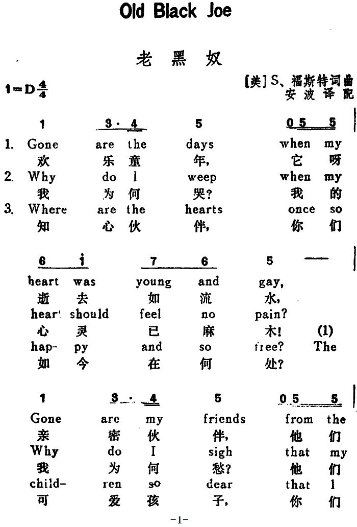 > 美 老黑奴 Old Black Joe 汉英文对照