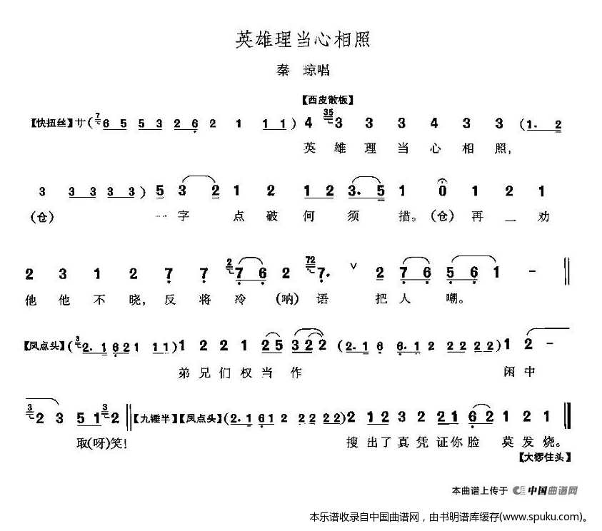 英雄理当心相照 响马传 秦琼唱段 唱谱