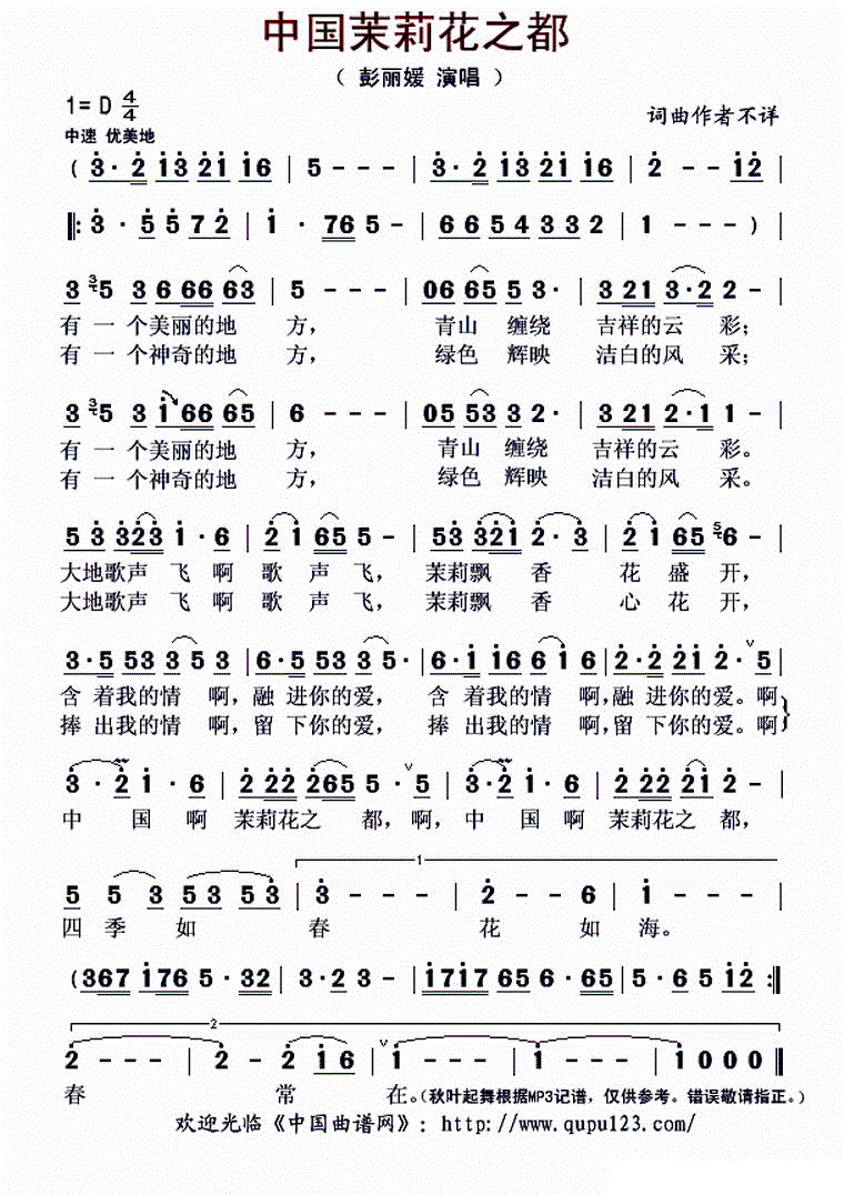 - [笛子谱,二胡谱,歌谱] 中国茉莉花