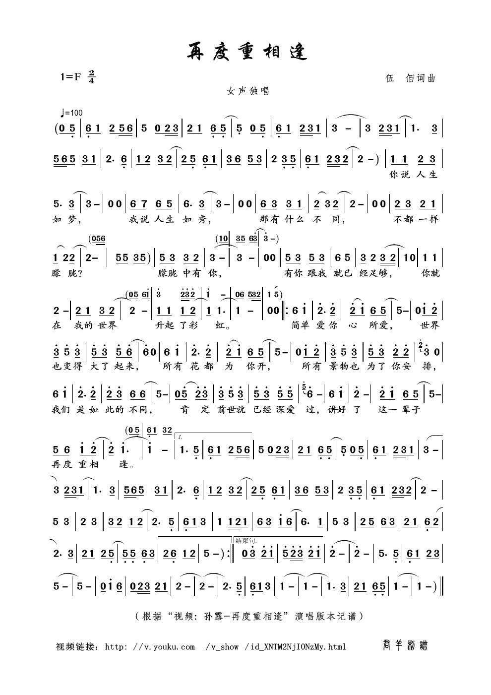 - [歌谱] 再度重相逢
