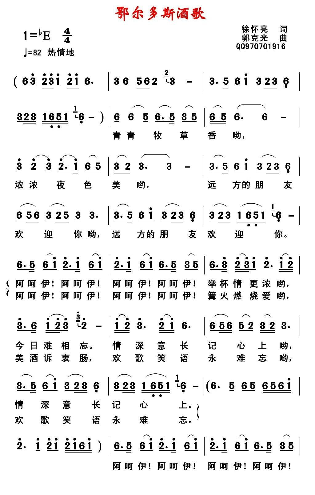 - [歌谱] 草原酒歌 鄂尔多斯民歌 乌嫩齐配歌