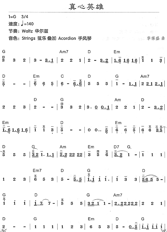 - [电子琴谱,歌谱] 真心英雄