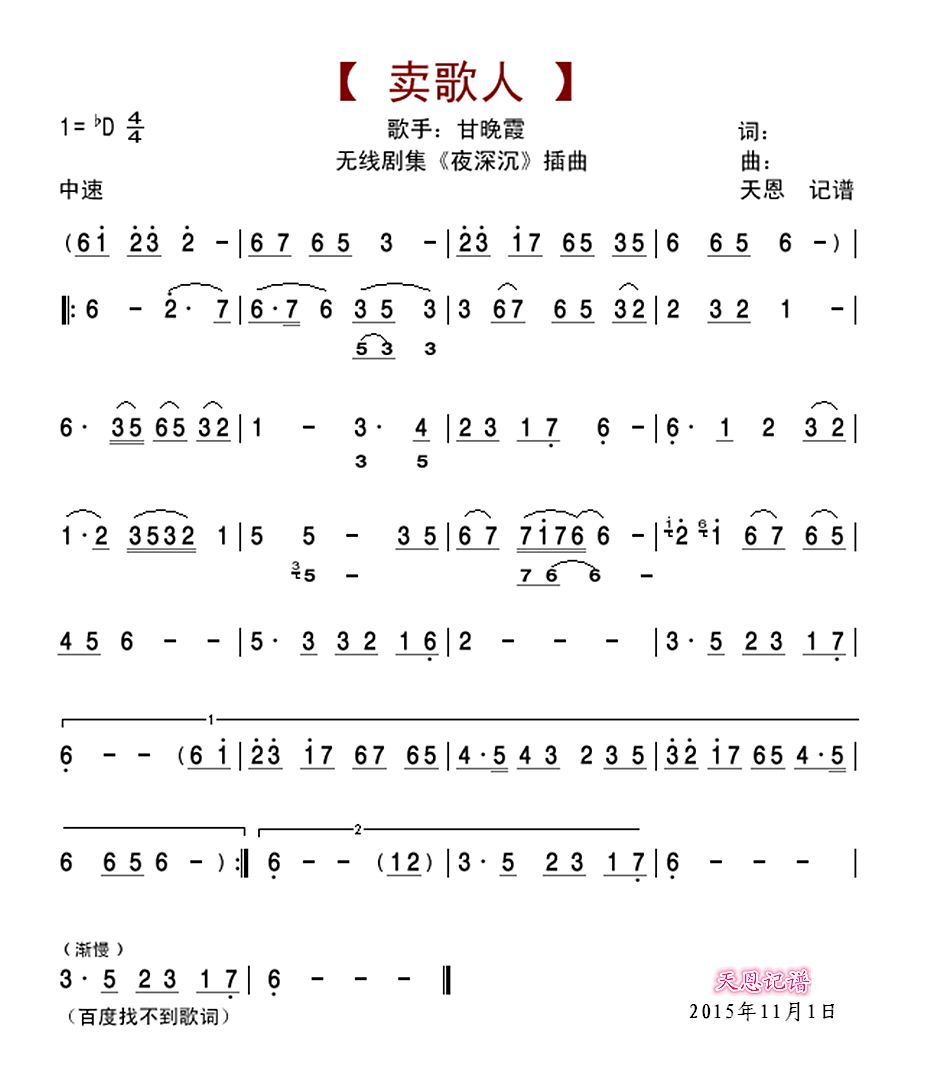 - [歌谱] 卖歌人 夜深沉 插曲缺歌词