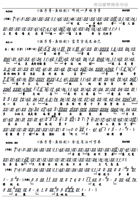 > 伍子胥 鱼肠剑 富贵穷通不由己 京剧选段 京胡谱