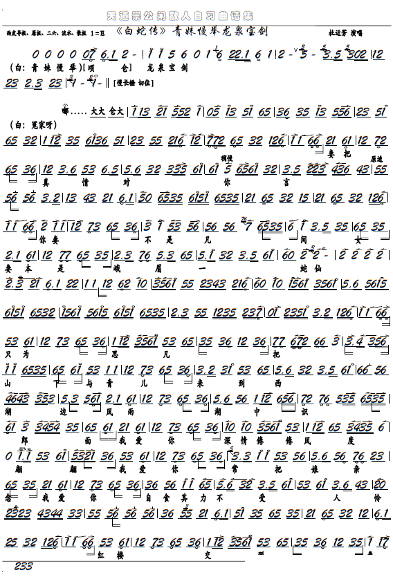 青妹慢举龙泉宝剑 白蛇传 选段 京胡伴奏谱 京剧唱谱