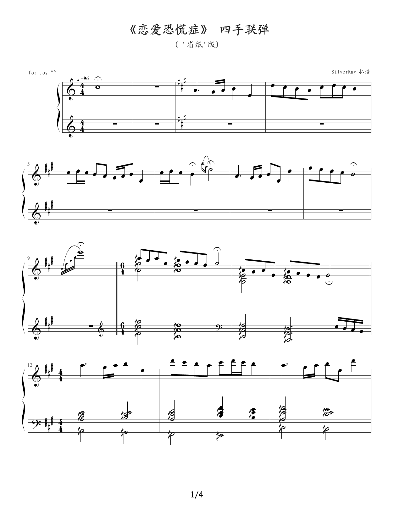 > 恋爱恐惧症 四手联弹 C调