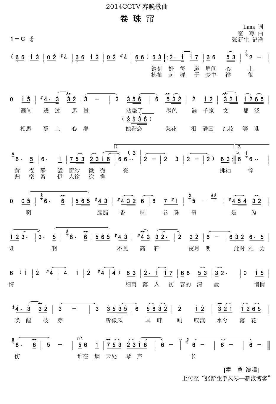 - [歌谱] 卷珠帘 2014央视元宵晚会 彩谱