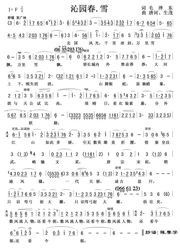 - [歌谱] 沁园春 雪 为毛主席诗词谱曲
