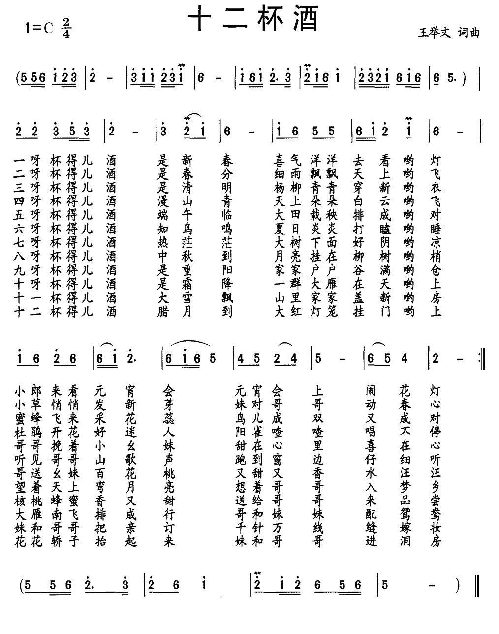 - [歌谱] 十二杯酒 原生态民歌