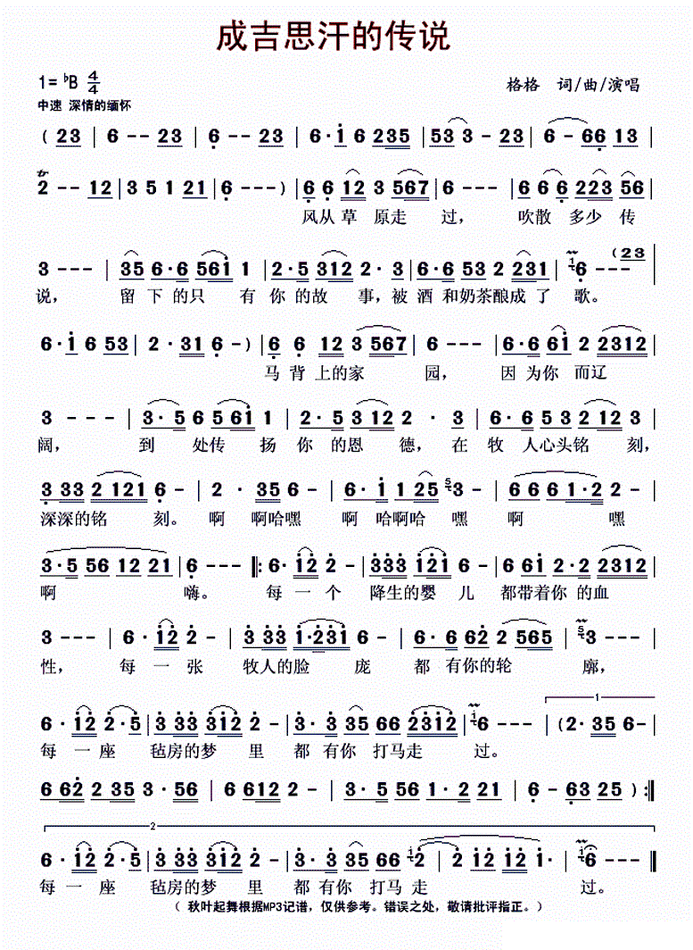 成吉思汗的传说 成吉思汗 主题歌 彩谱