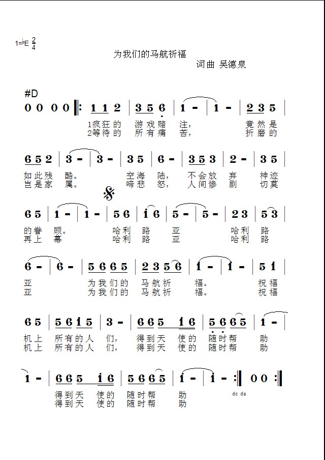为我们的马航祈福 词曲吴德泉旋律小小样