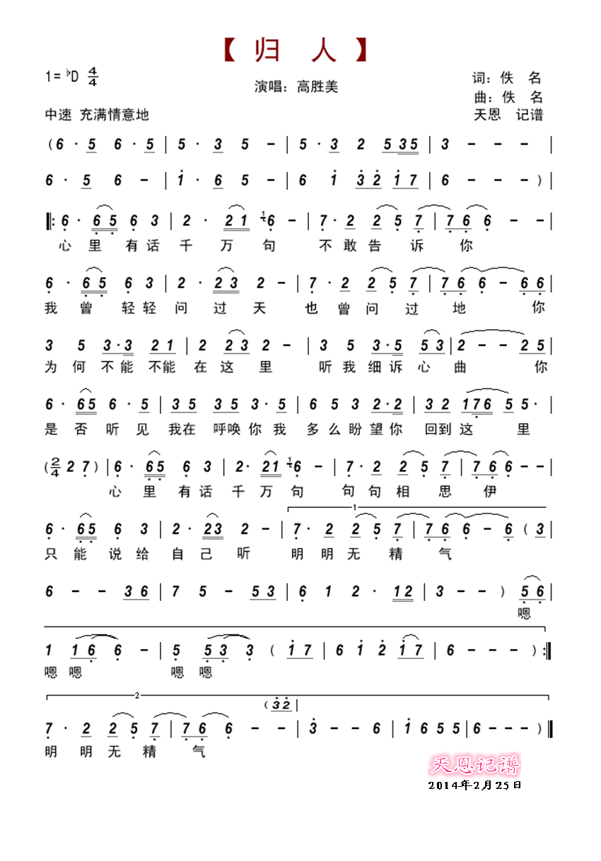 - [歌谱] 情归何处