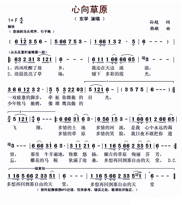 - [歌谱] 心向草原