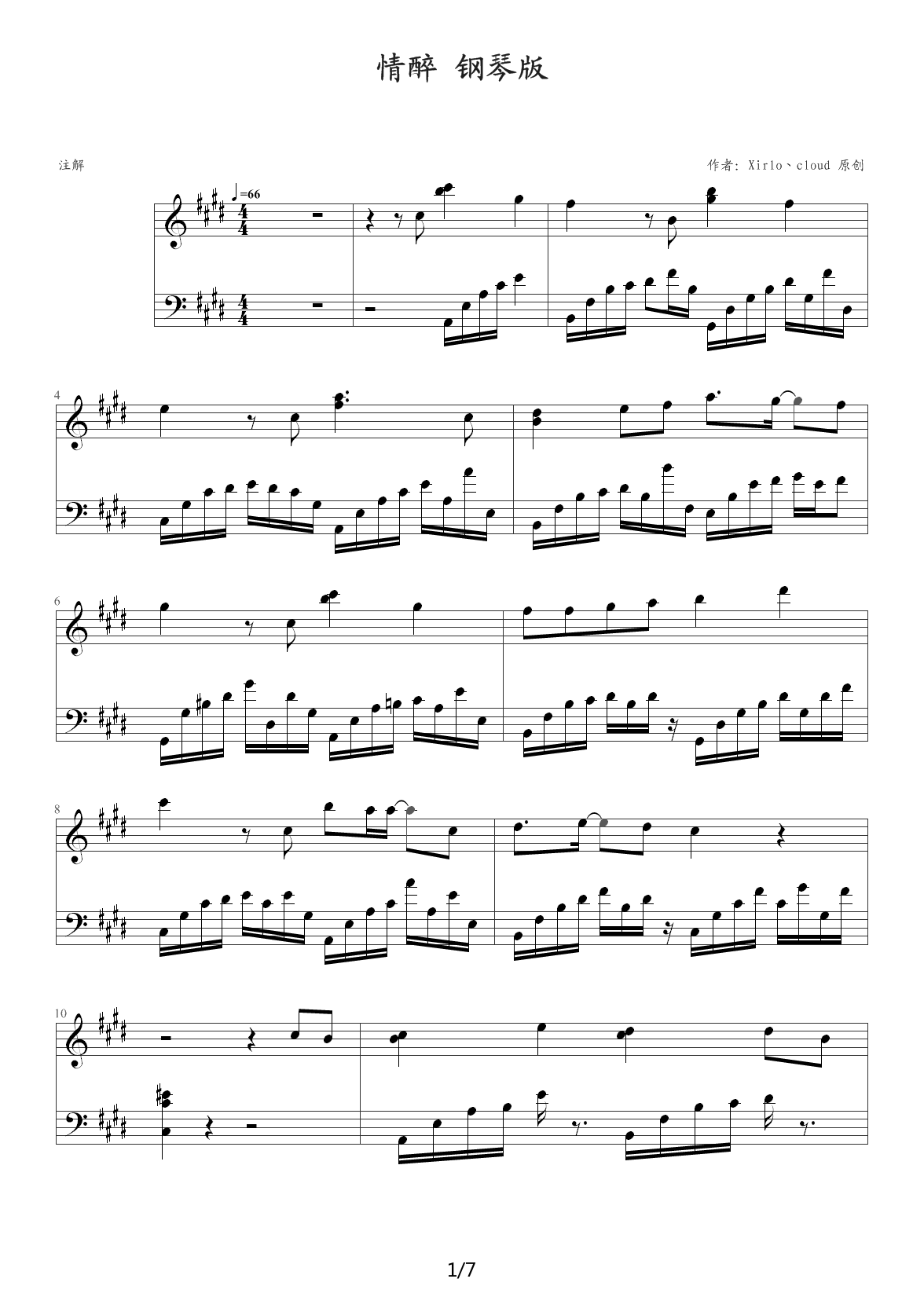 > 诛仙2 情醉 自创钢琴版 E调