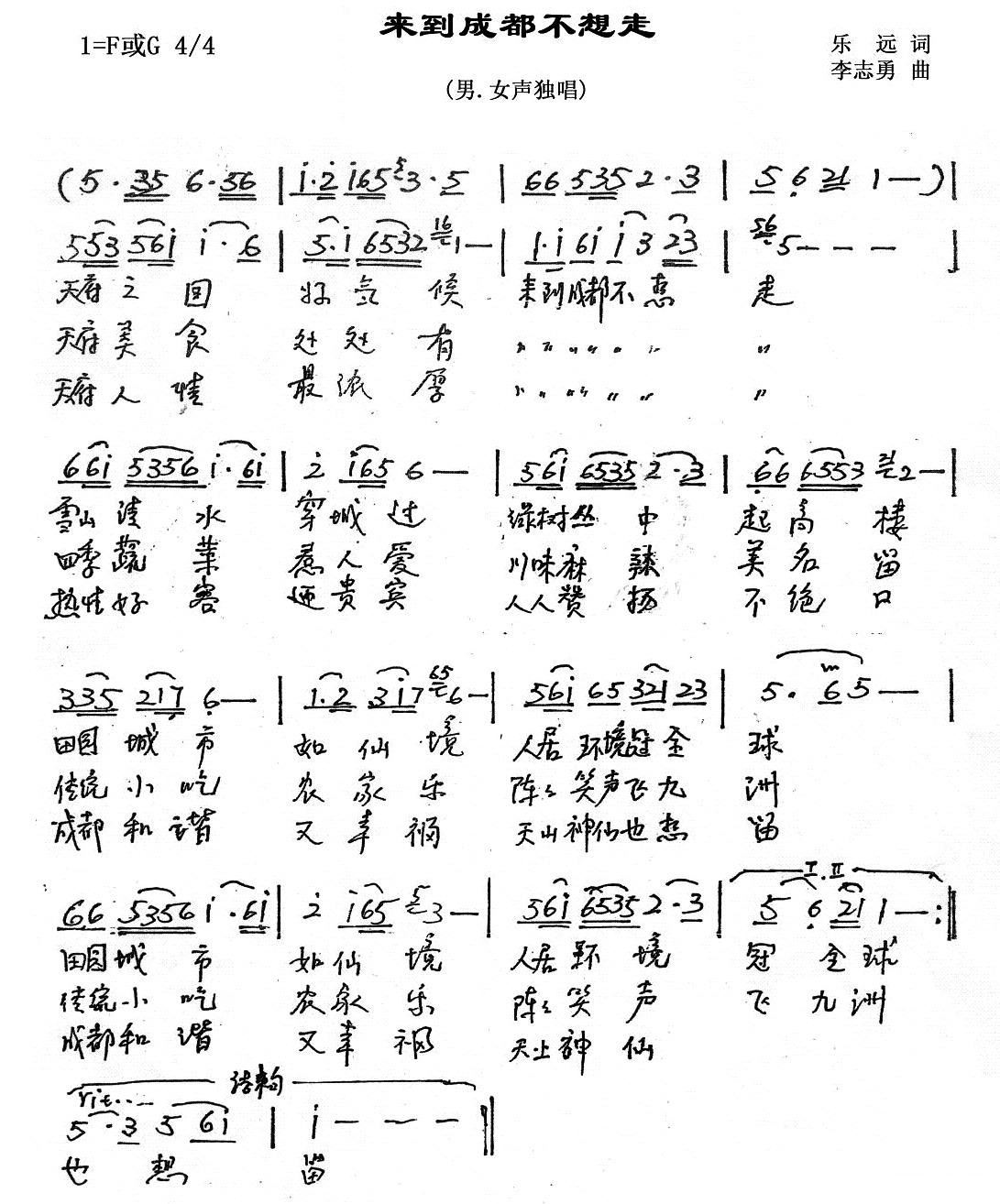 - [歌谱] 来到成都不想走