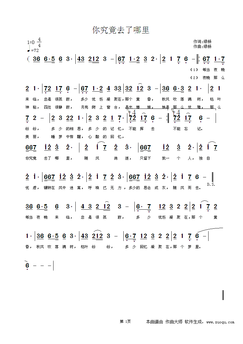 - [歌谱] 你究竟去了哪里
