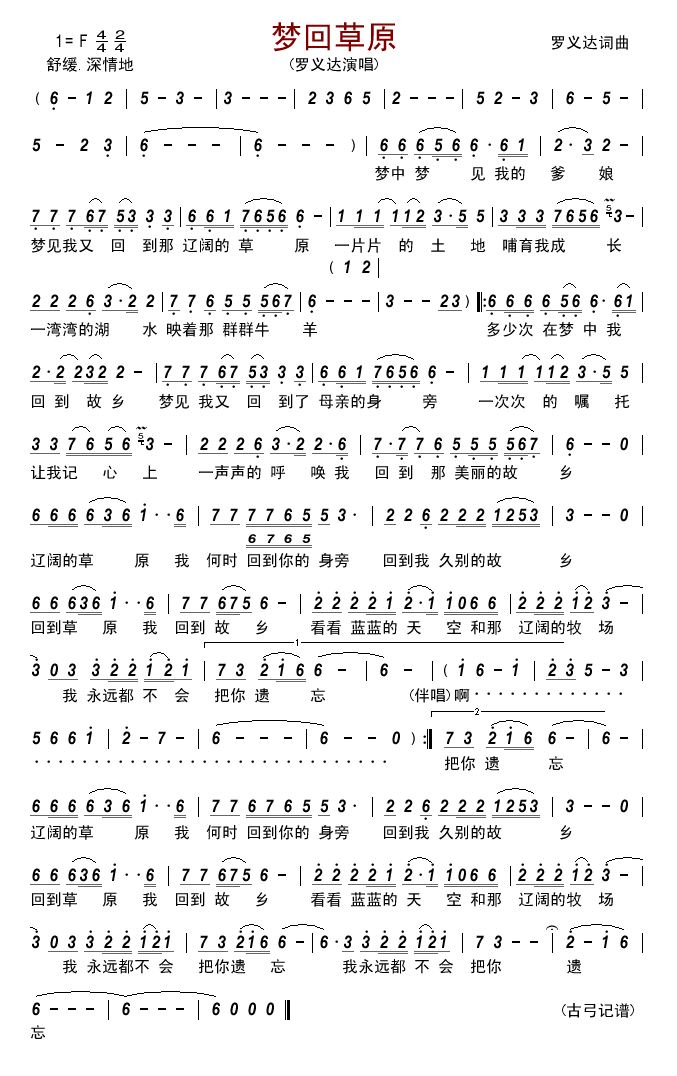 - [歌谱] 梦回草原 仁钦敖日布词曲