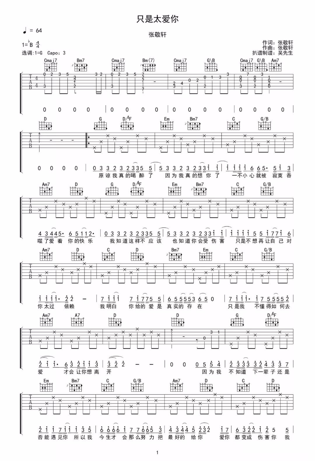 只是太爱你 G调指法原版编配