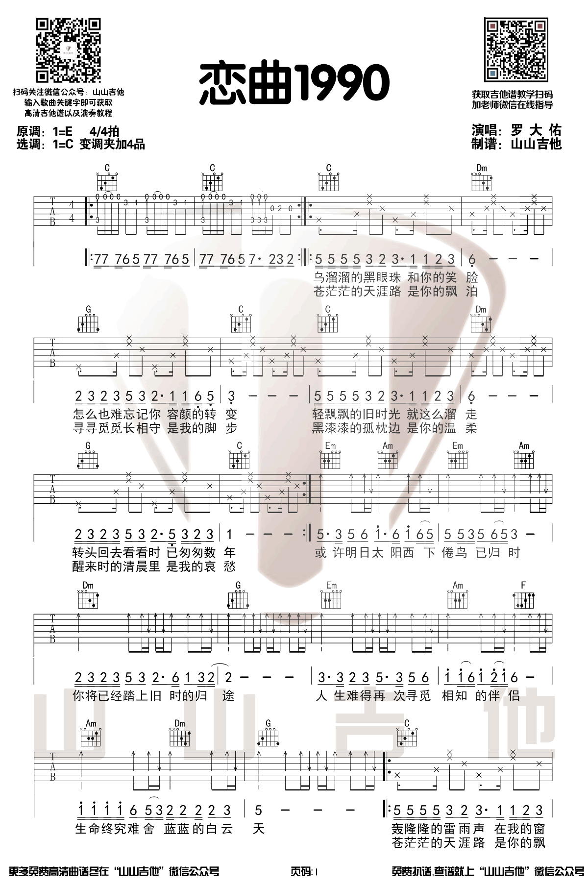 > 恋曲1990 C调原版编配