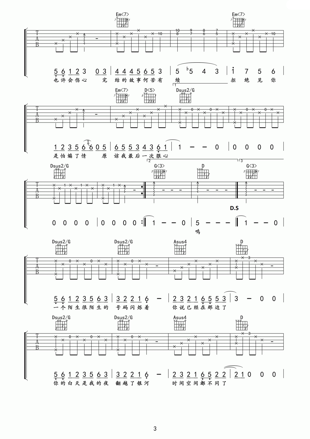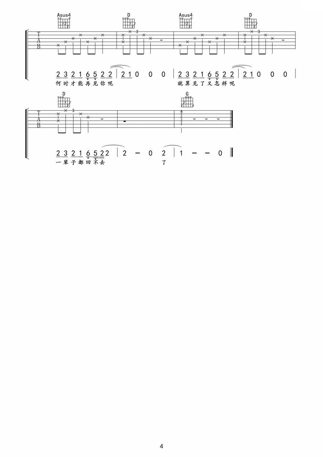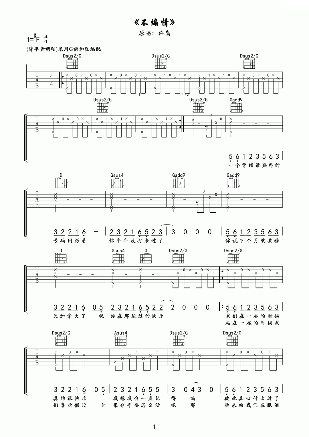 > 不煽情 G调指法原版编配