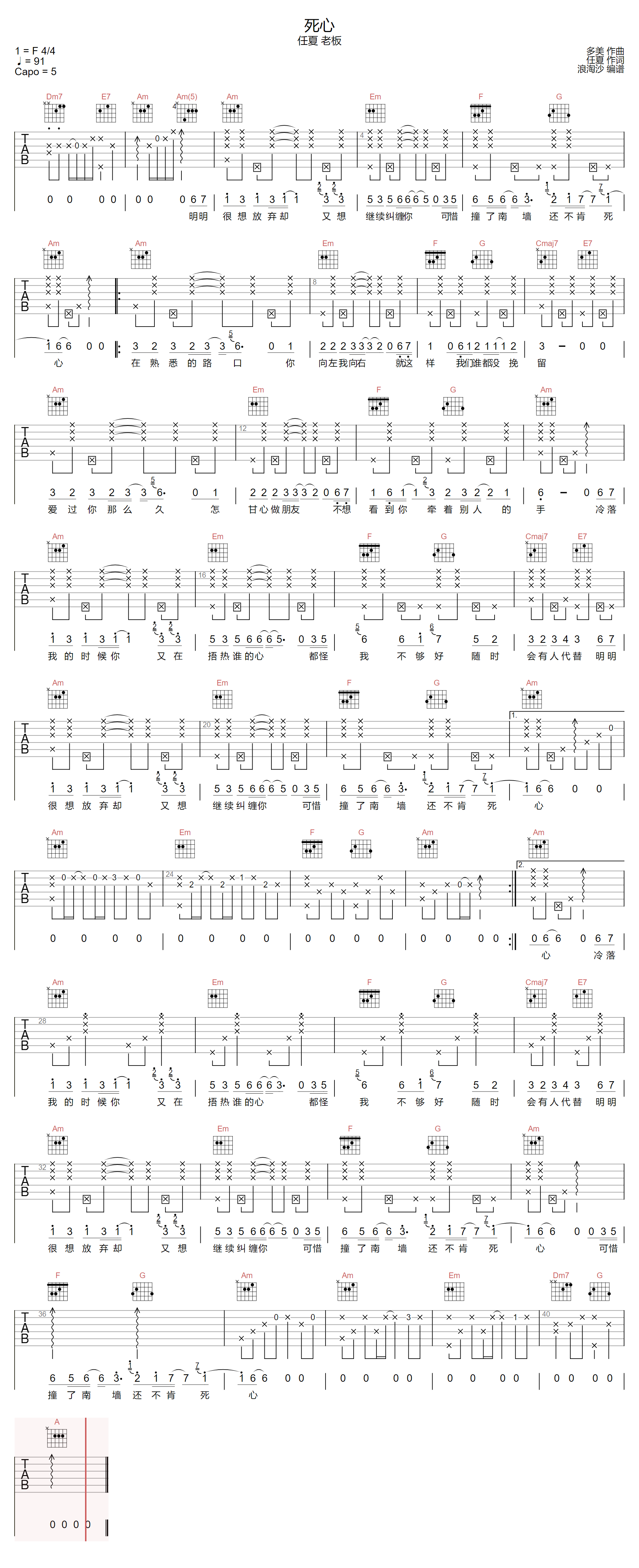 > 死心 老板 C调指法原版编配