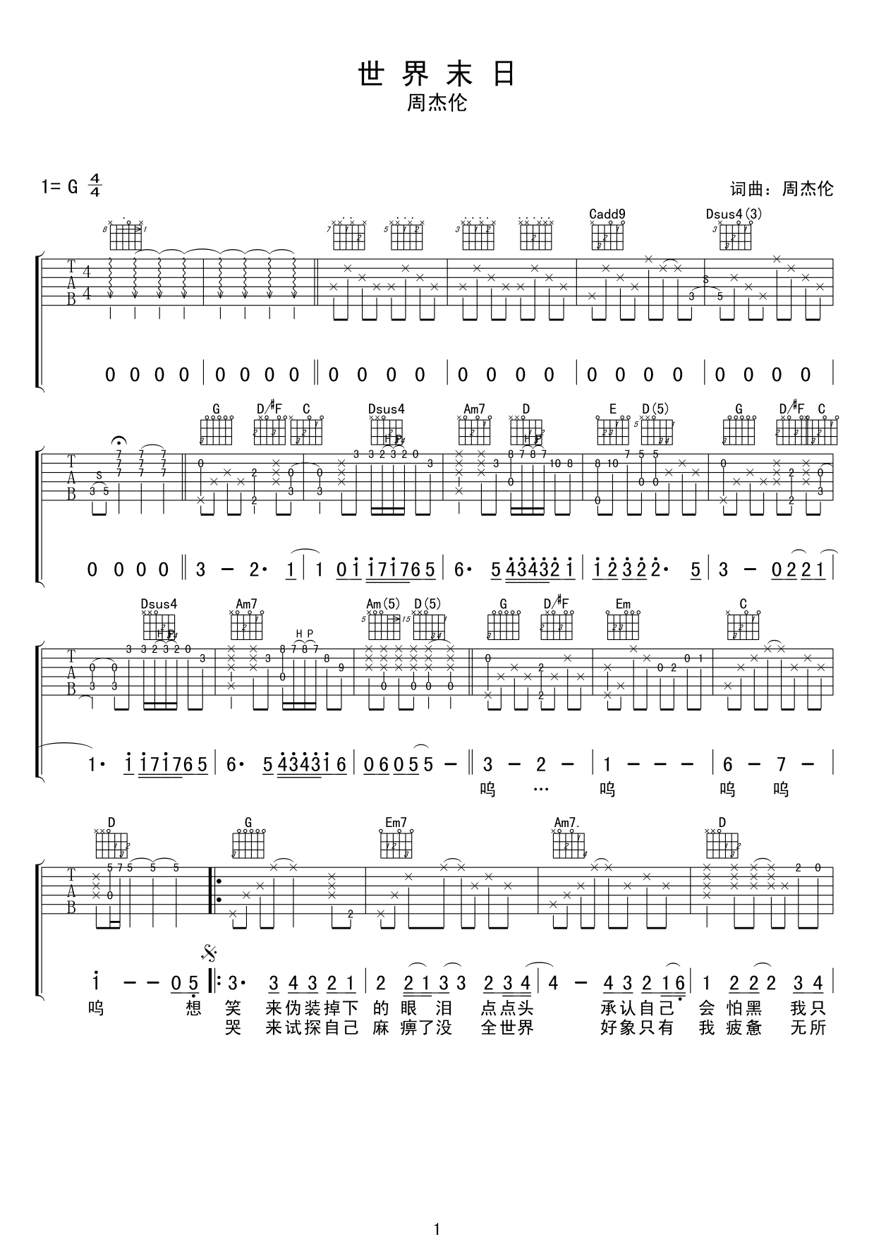 > 世界末日 G调指法原版编配