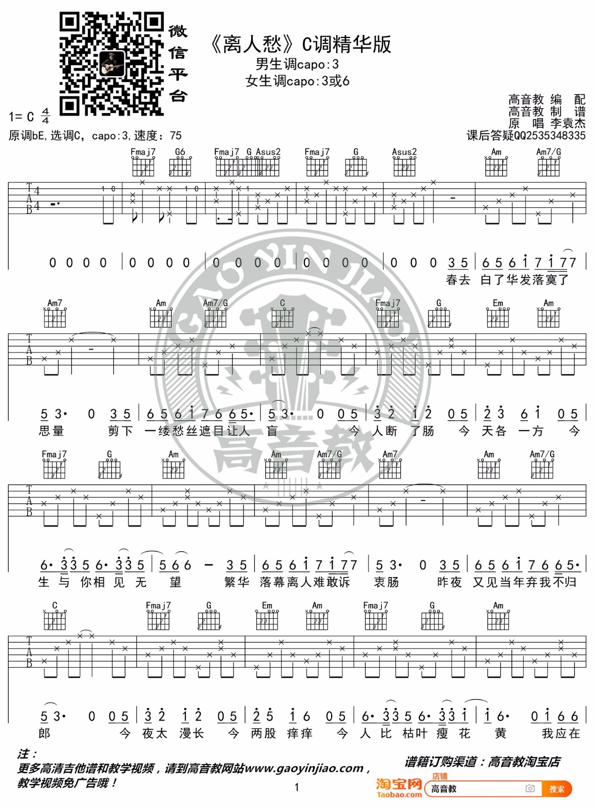 > 离人愁 C调原版编配