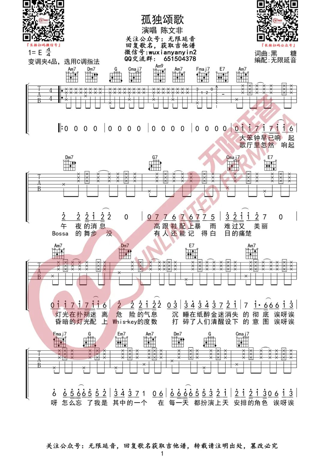 > 孤独颂歌 C调原版编配