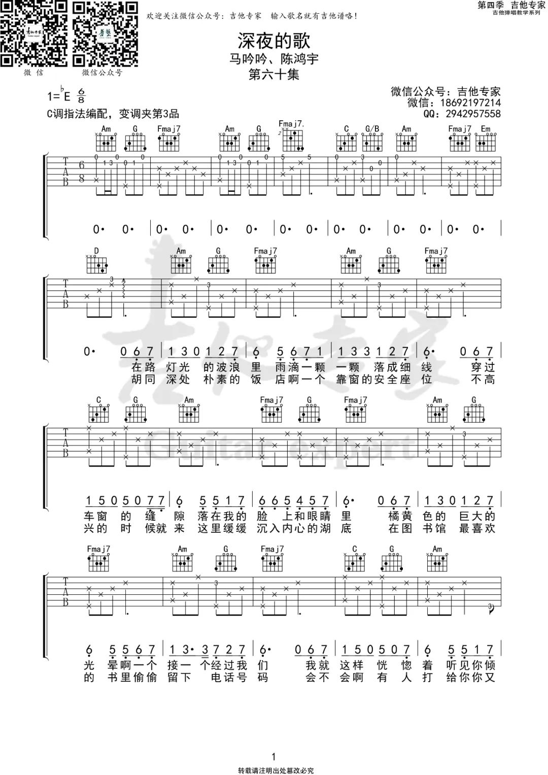 > 深夜的歌 马吟吟 C调原版编配